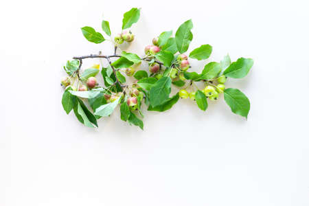 Small heavenly apples on a branch on a light paper background. Frame. Copy space. Top view.