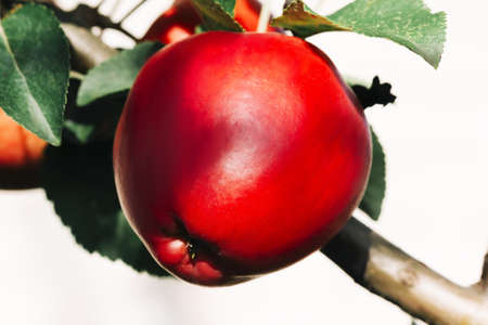Red apple on branch, close-up. bio organic red apple ready to be harvested in an orchard. Selective focus