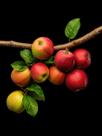 A close up of ripe red apples on a branch with green leaves against a stark black background, perfect for food or nature themes.