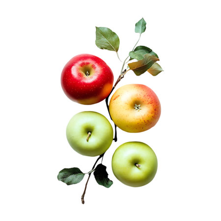 A close-up studio shot showcases four vibrant apples—two red and two green—arranged artistically on a slender twig adorned with delicate green leaves. The natural presentation highlights the freshness and healthfulness of the fruit.