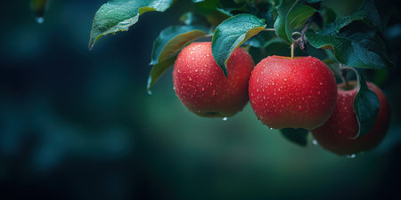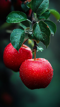 Macro shot of two ripe red apples hanging from a tree, covered with water droplets, representing freshness, organic farming, and healthy eating.
