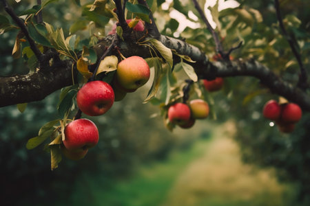 AI Generated. Red apples hanging from a tree branch in a serene orchard during summer