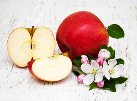Red apples with flower on table