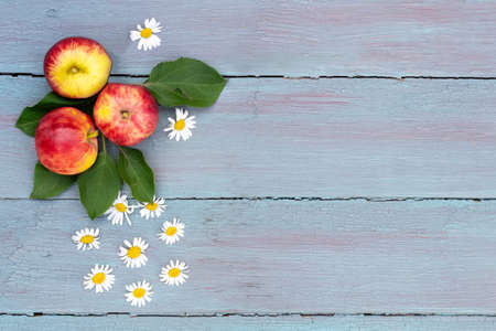 Flat lay seasonal harvest of garden apples and chamomile flowers on blue wooden background with copy space, top view, horizontal photo.