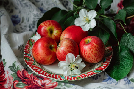 Vibrant Apple flowers plate nature. Harvest ripe. Generate Ai