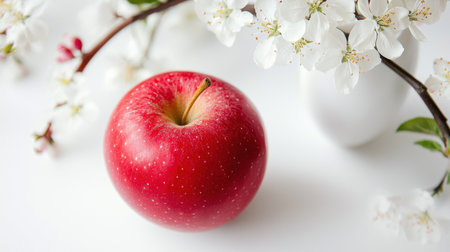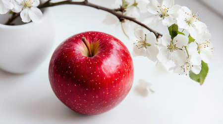A vibrant red apple placed next to delicate white blossoms, creating a beautiful contrast against a soft, light background. This image captures the essence of freshness and springtime