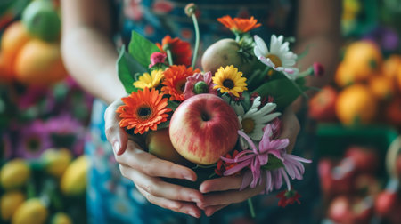 Girl holding a bouquet of flowers and fruits in her hands.
