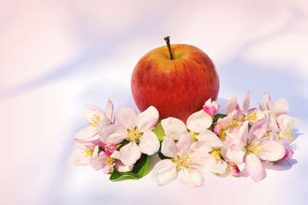 beautiful designer background with the sprigs of flowering apple-tree and red apple
