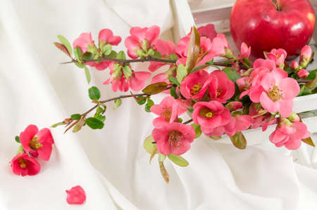 Still life with red apples and cherry blossoms. Selective focus.