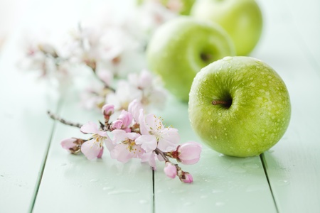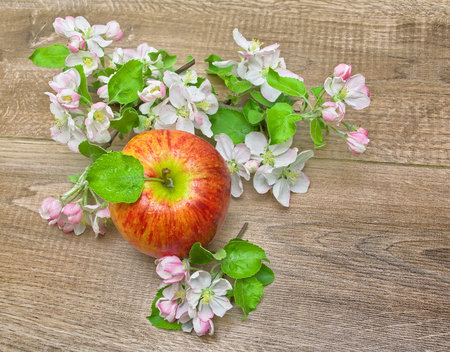 apples and apple tree blossoms on a wooden background