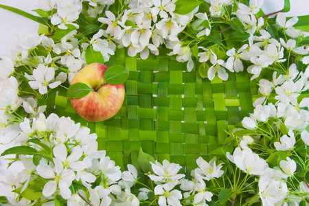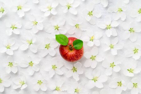 Red apple on a background of white flowers of an apple tree. Flat lay