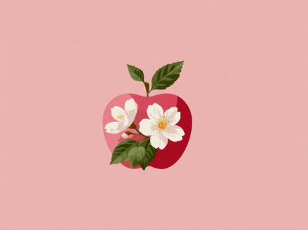 A striking composition features a shiny red apple adorned with delicate white blossoms and green leaves. Set against a soft pink backdrop, the illustration employs a clean, minimalist style. This visual could be suitable for various commercial applications, including editorial designs and marketing materials.