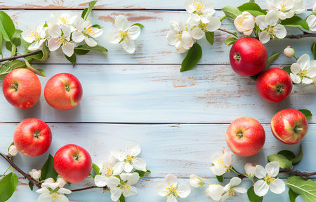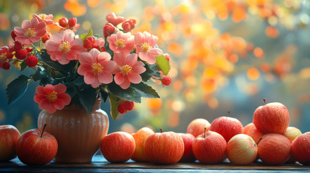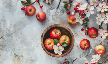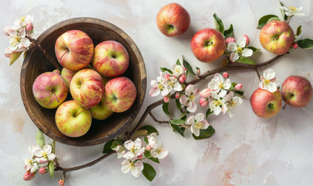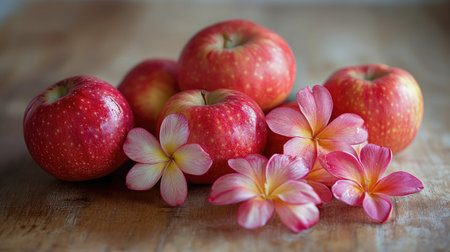 A captivating composition of fresh red apples and delicate pink flowers resting on a rustic wooden surface, perfect for showcasing natural beauty and freshness.