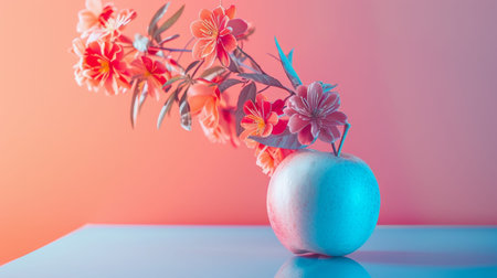 Artistic composition of an apple with flowers on a pink background, blending natural elements with a vibrant, modern aesthetic.
