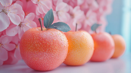 A vibrant illustration presents a red apple adorned with delicate white flowers and green leaves. Set against a soft pink backdrop, the design showcases a balanced composition with smooth textures and bright colors. This versatile image could be used for various projects, including editorial content or commercial applications.