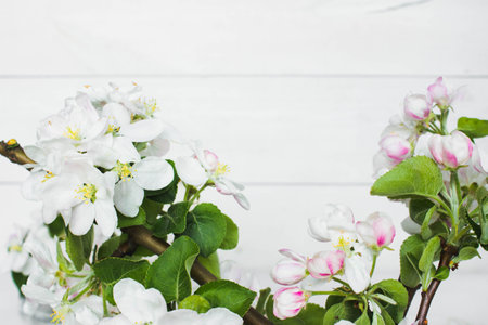 Apple blossoms on white wooden background with copy space