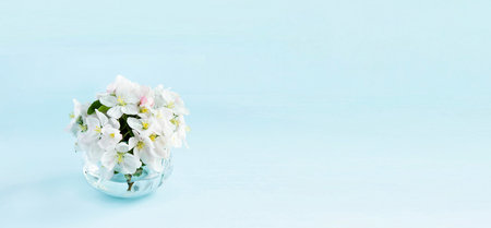 Banner with a beautiful sprig of an apple tree with white flowers in a glass vase against a blue background. Blossoming branch in a glass with water. spring still life. Place for text. Concept of spring or mom day.