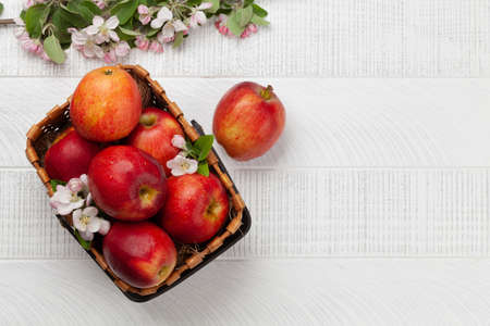 Ripe red apples and apple blossom flowers in basket. Top view flat lay with copy space