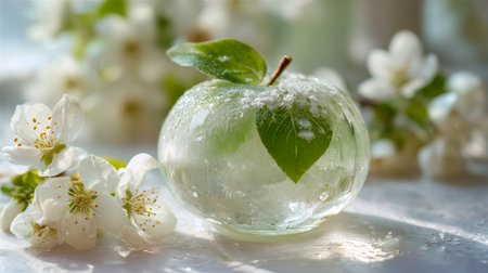 A glistening ice-encased apple adorned with tender blossoms and a mirrored leaf, evoking calmness and the quiet beauty of winter's embrace.