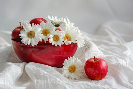 A composition of white daisies and red apples, placed in a red bowl on a white tablecloth.