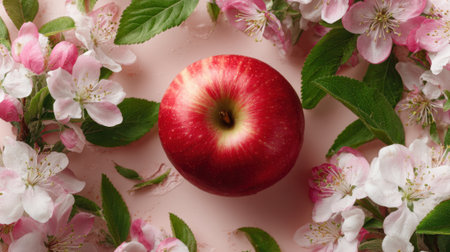 A fresh red apple sits in the center embraced by blooming pink flowers and green leaves.