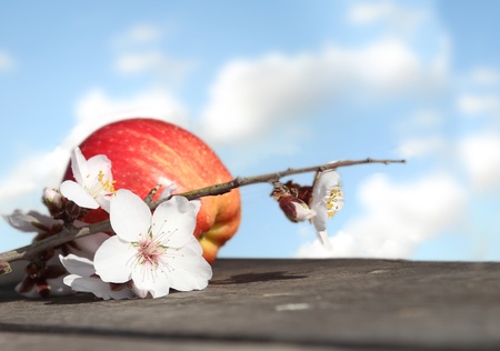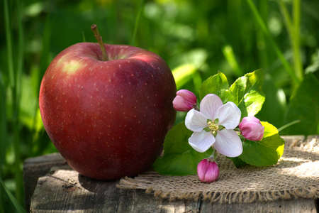 Red apple and apple blossoms on a wooden bench in the shadow of the garden and blurred green grass background