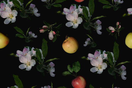 Fresh yellow apples and apple tree flowers on a black surface and top view. fruit pattern.
