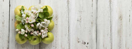 Apple blossom on a wooden white background. A square of green apples is filled with flowering branches. Copy space and horizontal orientation