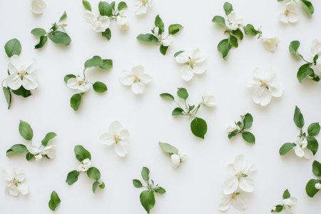 Scattered white apple blossom flowers and green leaves arranged on a clean white background for spring botanical decor.