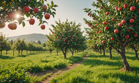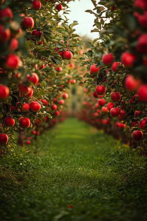 Rows of lush apple trees filled with bright red apples create a picturesque pathway in an orchard during the golden hour. The green grass invites visitors to explore.