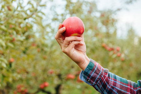 Close up is ripe red apple in hand of farmer who is harvesting. Unrecognizable hand of a young man on a blurred background of an apple orchard. Beautiful ripe fruit in the hands of a caring picker.