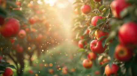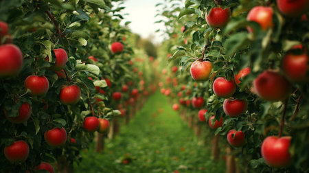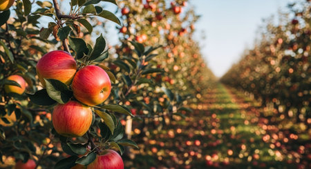 Apple orchard in autumn with ripe red apples ready for harvest.