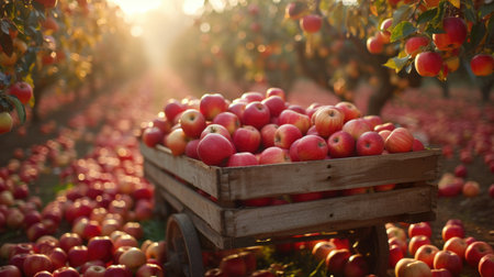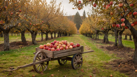 A wooden cart overflowing with freshly harvested red and yellow apples sits in a picturesque apple orchard. The trees are laden with fruit, and the scene evokes the essence of autumn and a bountiful harvest.