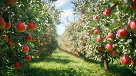 A serene apple orchard filled with ripe apples, showcasing lush greenery under a bright blue sky, perfect for nature lovers.