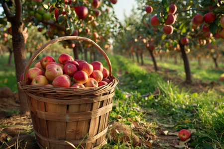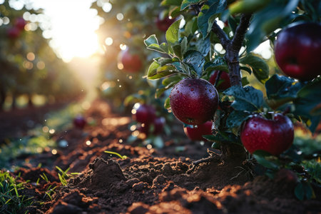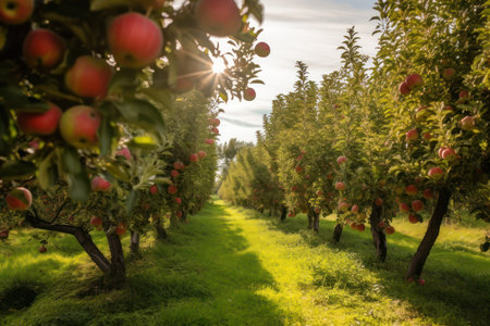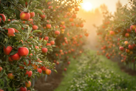 Tranquil sunset over organic apple orchard, ripe fruit in foreground generated by artificial intelligence