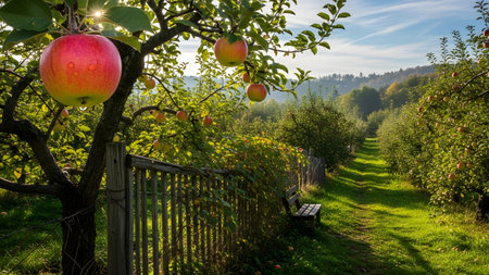 A serene orchard scene with ripe red apples hanging from tree branches, surrounded by lush green grass and a wooden fence, set against a backdrop of trees and a blue sky with wispy clouds.