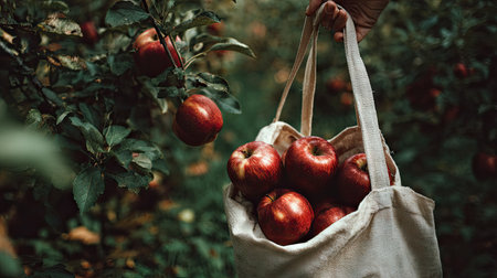 A hand carries a cotton tote bag filled with fresh red apples among lush green trees in an orchard, showcasing the essence of autumn harvest and natural beauty.