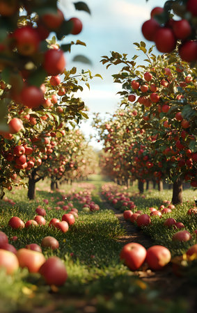 Rows of apple trees are laden with bright red fruit, creating a beautiful pathway. Sunlight filters through the branches, illuminating the grassy ground strewn with fallen apples.