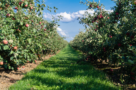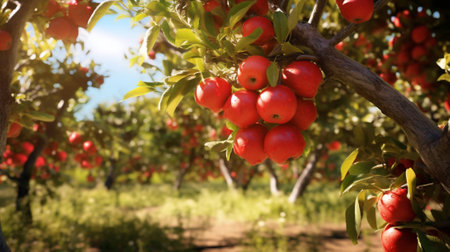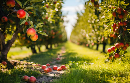 Apple orchard with ripe red apples ready to harvest on a sunny summer day