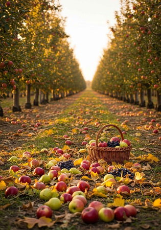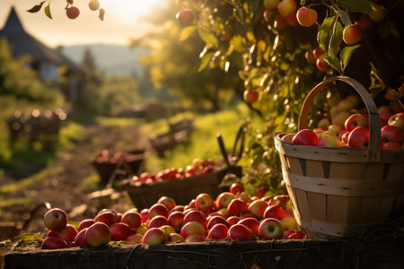 A picturesque rural scene of a sun-kissed apple orchard during harvest season, with trees laden with ripe fruits
