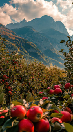 Lush apple trees bearing bright red fruit stretch across the landscape, framed by majestic mountains under a warm autumn sky. Nature's beauty is on full display.