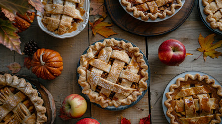 Lattice pies, apples and pumpkins for seasonal celebrations closeup image, ai generated. Overhead thanksgiving desserts close up photography. Traditional homemade food concept photo realistic