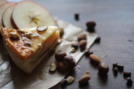 Macro photography of tasty pear tart on wood cutting board