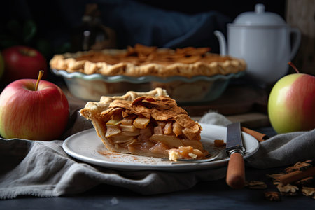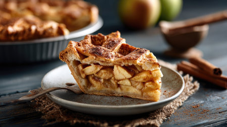 A tempting slice of freshly baked apple pie rests on a rustic plate, surrounded by ingredients, showcasing warm colors and inviting textures perfect for autumn.