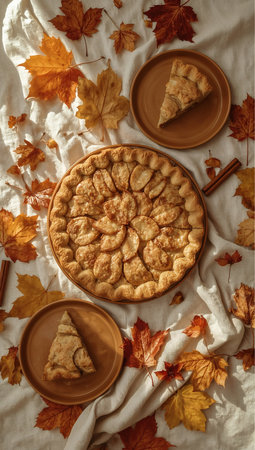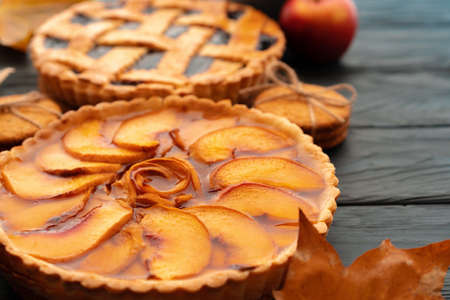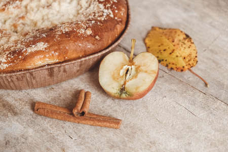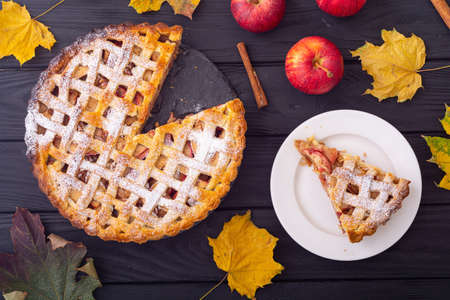 Homemade apple pie with cinnamon on a wooden background with autumn leaves