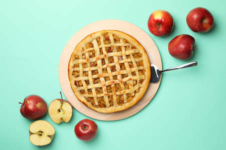 Composition with apple pie and ingredients on mint background, top view