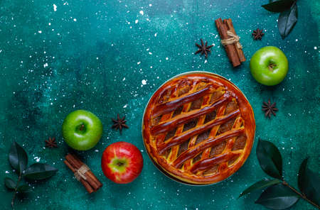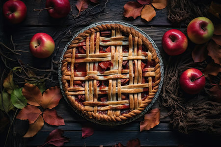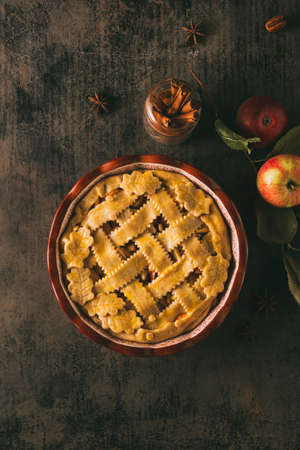 Apple pie decorated with lattice overhead shot, fall baking concept.