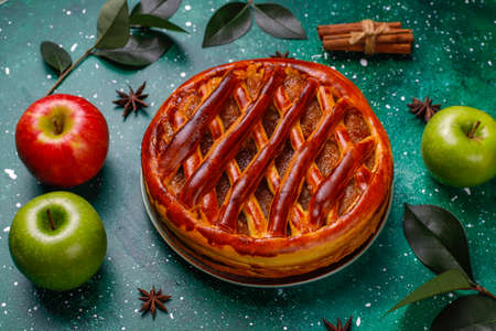 Sweet pie with apples, pears, and cinnamon, a homemade dessert. Apple pie as a food background for your design.