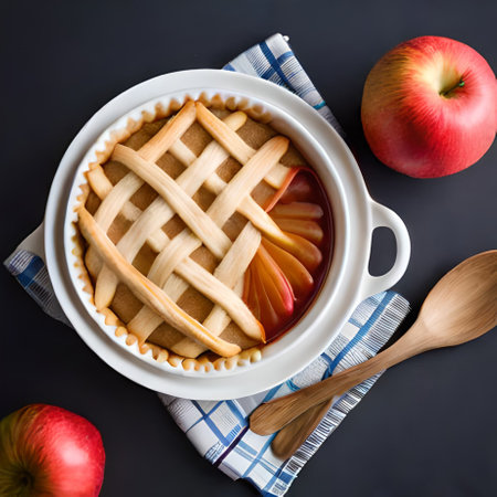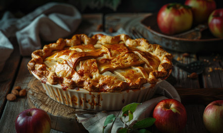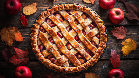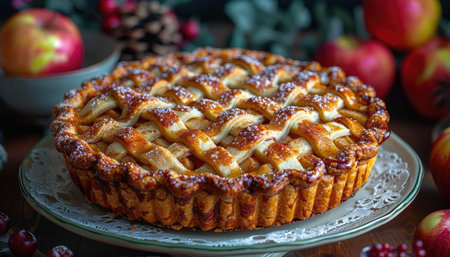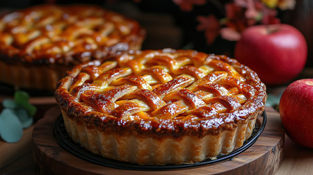 A sumptuous golden apple pie featuring a beautifully crisp lattice crust. Perfect for dessert lovers, this pie embodies warmth and classic flavor, ideal for seasonal gatherings.