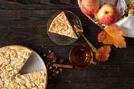 apple pie with caramelized apples and cup of tea on wooden table